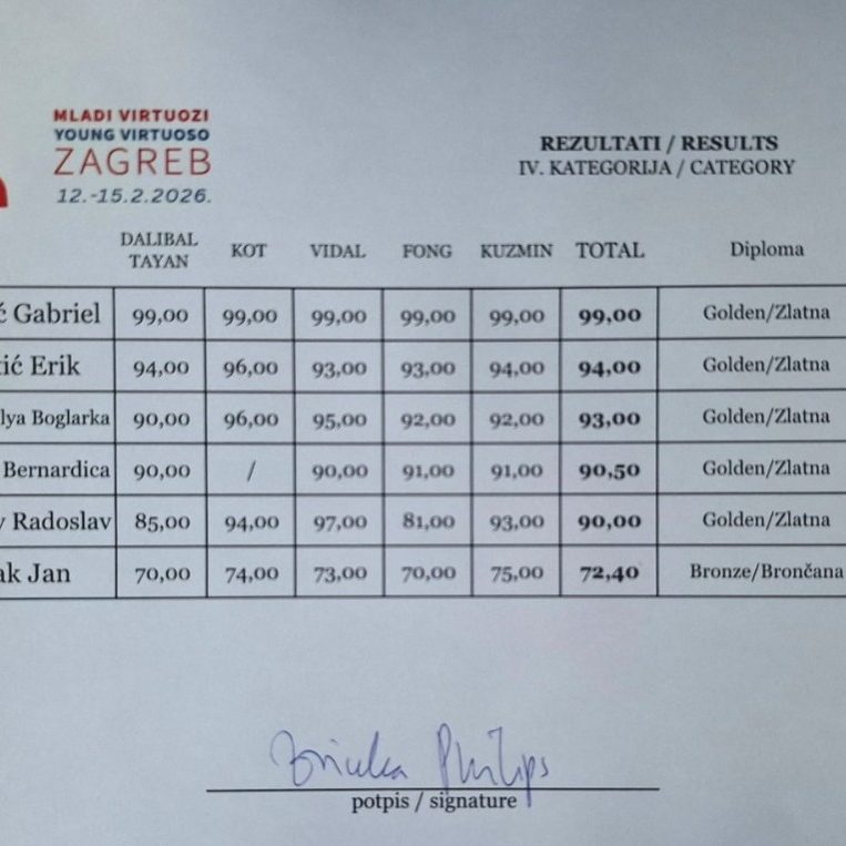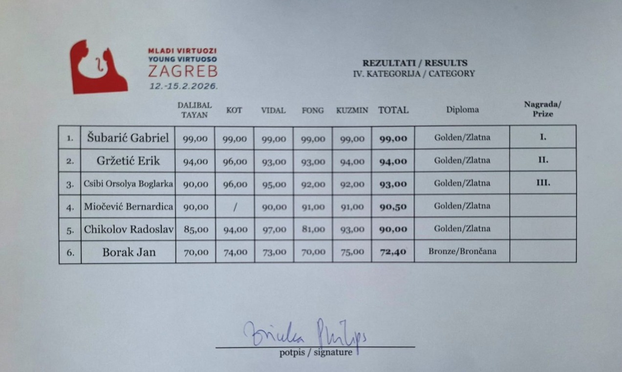 Na velikom i prestižnom 32. međunarodnom natjecanju Mladi virtuozi Zagreb 2026 – klavir, održanom od 12. do 15. veljače 2026. godine na Muzičkoj akademiji Sveučilišta u Zagrebu, našu školu predstavljao je učenik 2. razreda srednje škole Gabriel Šubarić.