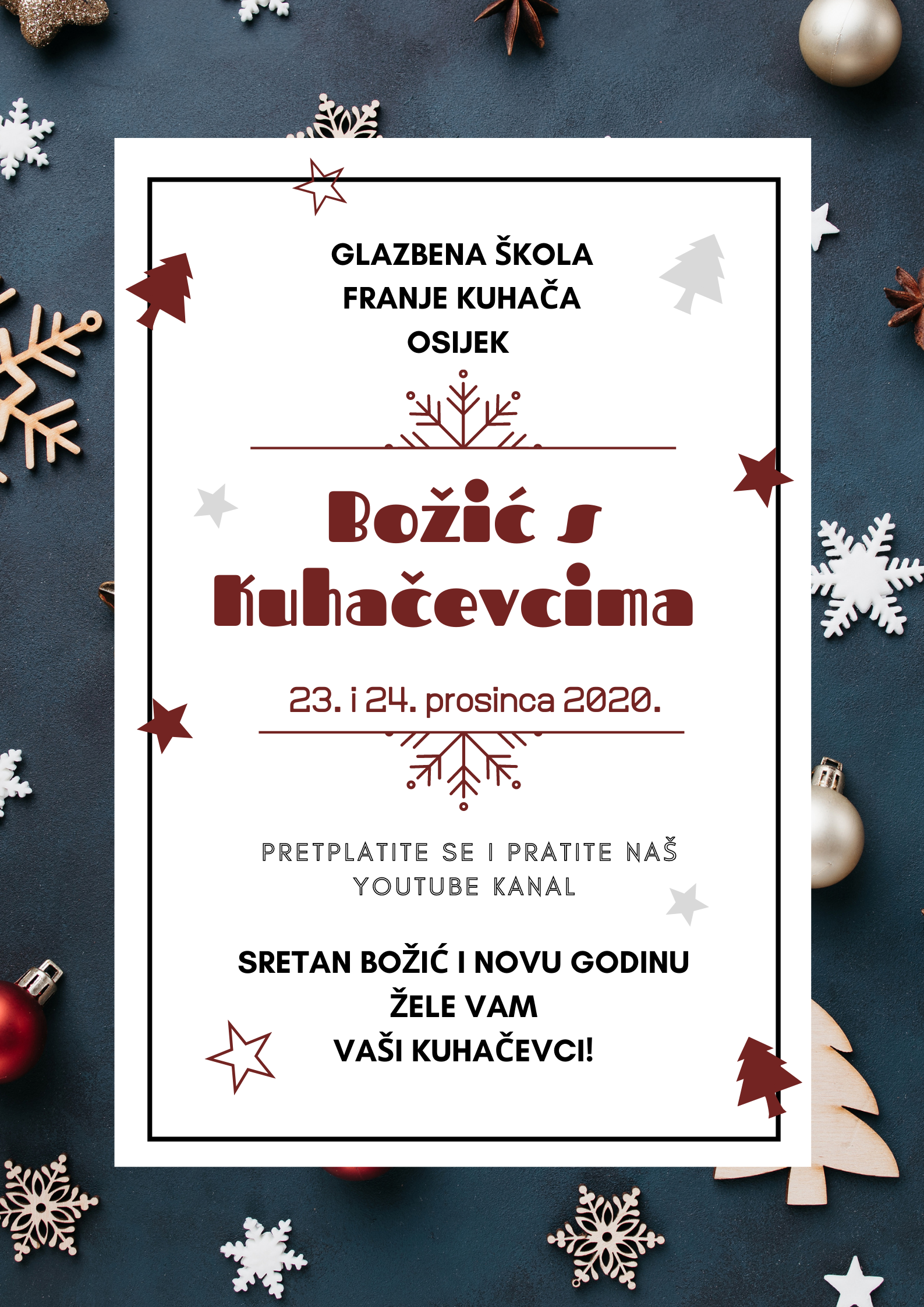 ?Dragi učenici, poštovani roditelji, prijatelji i pratitelji, s veseljem najavljujemo i pozivamo vas na već tradicionalni Božić s Kuhačevcima. Ove smo godine u virtualnom izdanju.